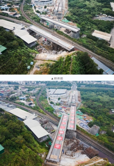 當(dāng)天7時(shí)04分,轉(zhuǎn)體橋梁開始轉(zhuǎn)體,經(jīng)過(guò)44分鐘施工,成功完成高空“二人轉(zhuǎn)”,為下一步順利實(shí)現(xiàn)通車運(yùn)營(yíng)奠定堅(jiān)實(shí)基礎(chǔ)。轉(zhuǎn)體橋上跨既有漳龍線、龍東線及煤場(chǎng)專用線3條鐵路貨運(yùn)營(yíng)業(yè)線,距離營(yíng)業(yè)線最近距離僅5.9米,施工難度大,危險(xiǎn)系數(shù)高。